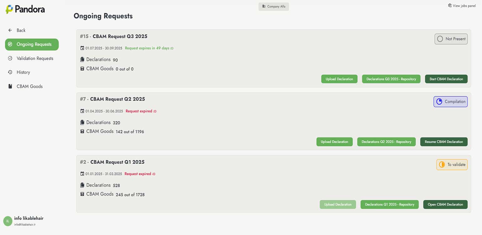 Pandora affronta questa sfida con un approccio integrato. Automatizza la gestione dei documenti doganali, garantisce tracciabilità completa e assicura il rispetto degli obblighi CBAM attraverso calcoli e report automatizzati. In questo modo, le imprese possono semplificare la compliance, ridurre i rischi di contestazioni e ottenere una visione chiara e unificata delle proprie operazioni internazionali.